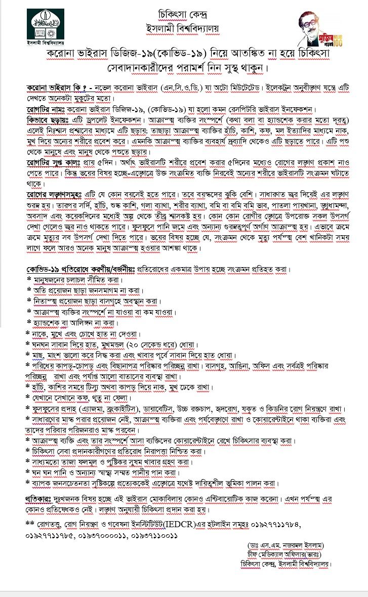 ইসলামী বিশ্ববিদ্যালয়ের মাননীয় ভাইস চ্যান্সেলরের সভাপতিত্বে সিন্ডিকেট সভায় করোনা প্রতিরোধে জনসচেতনতামূলক "Corona Prevention Cell" গঠন করা হয়েছে।